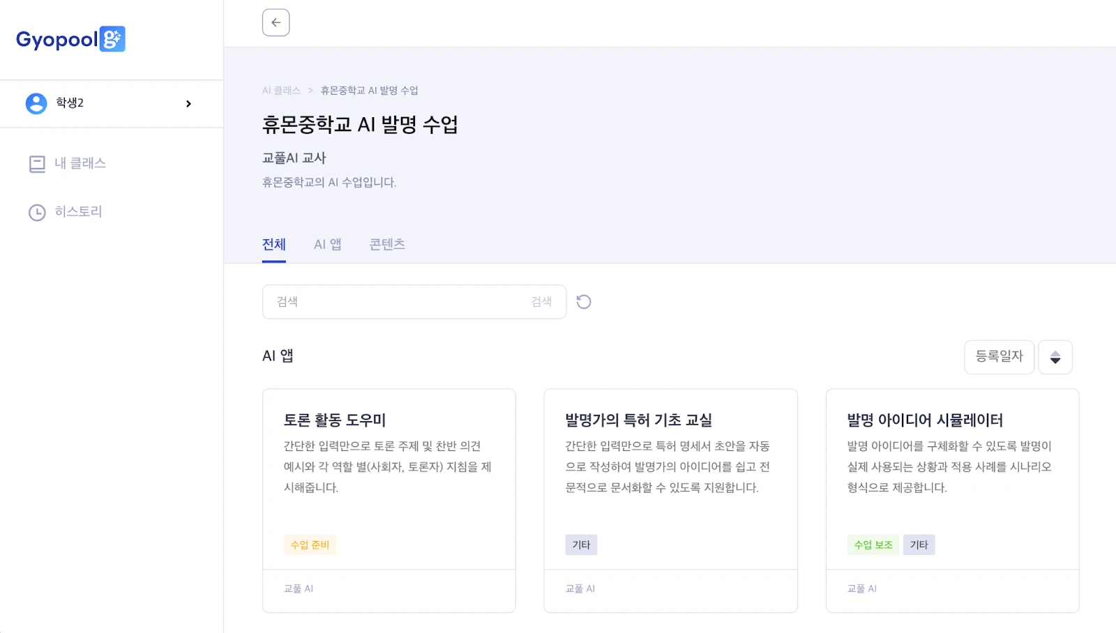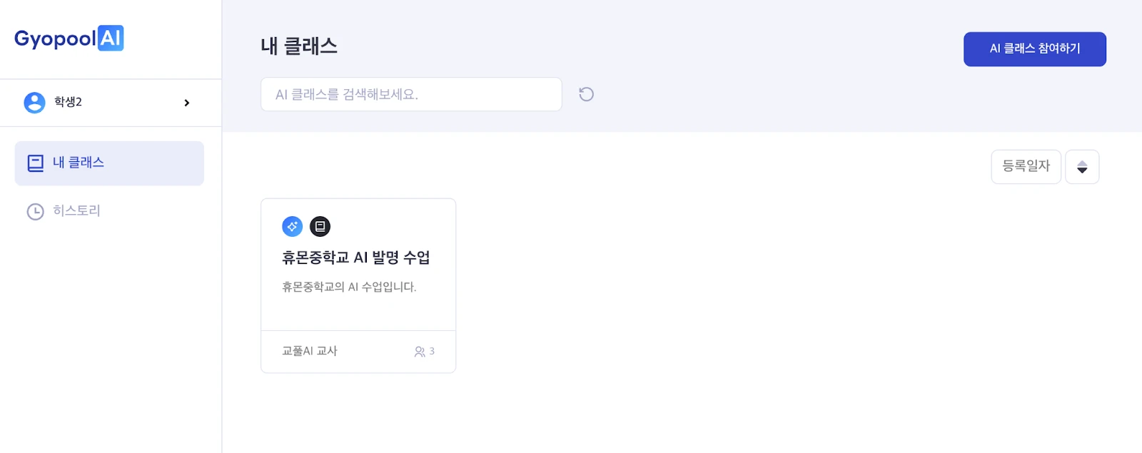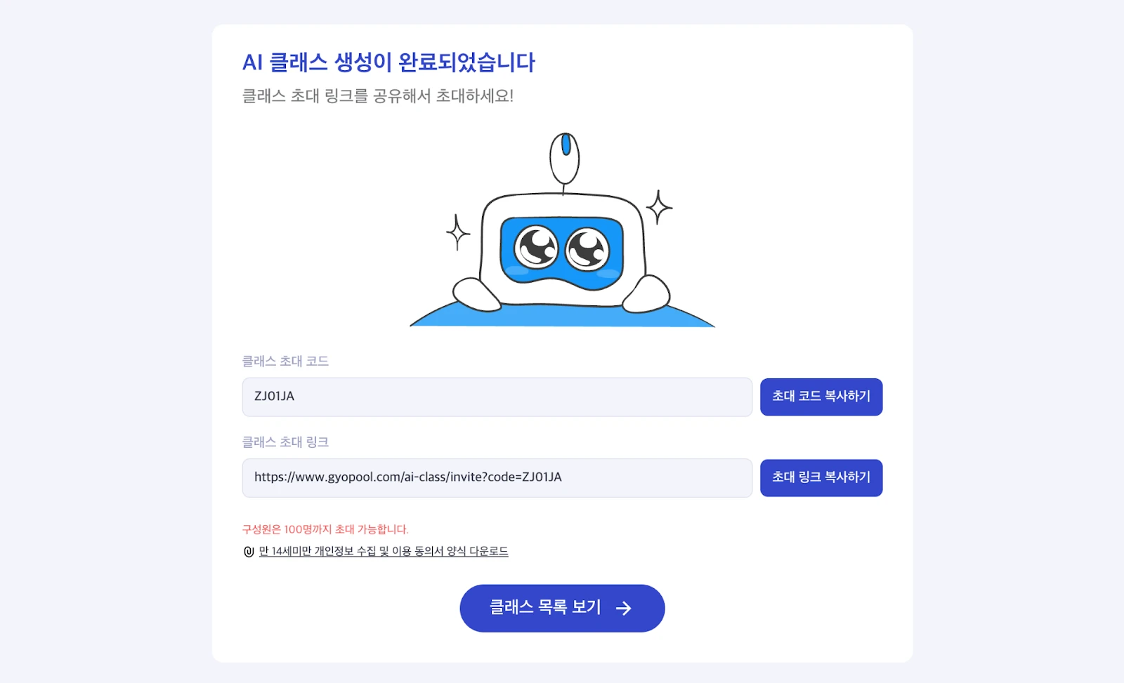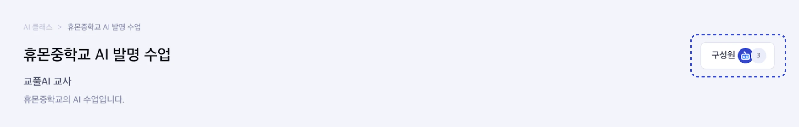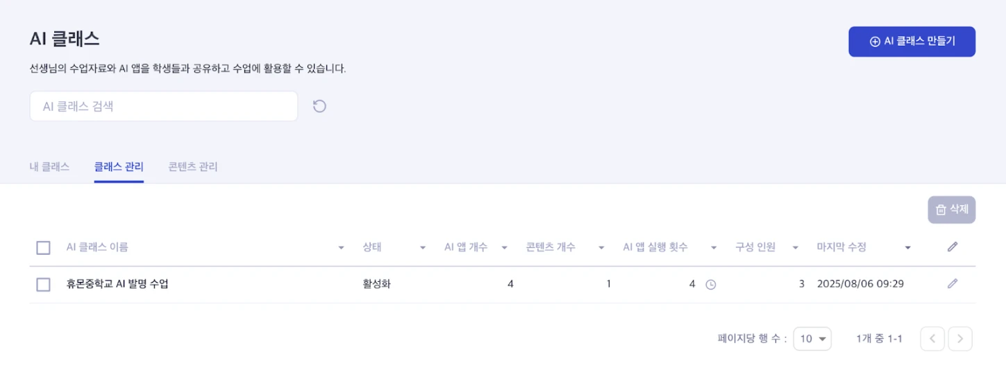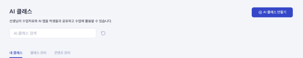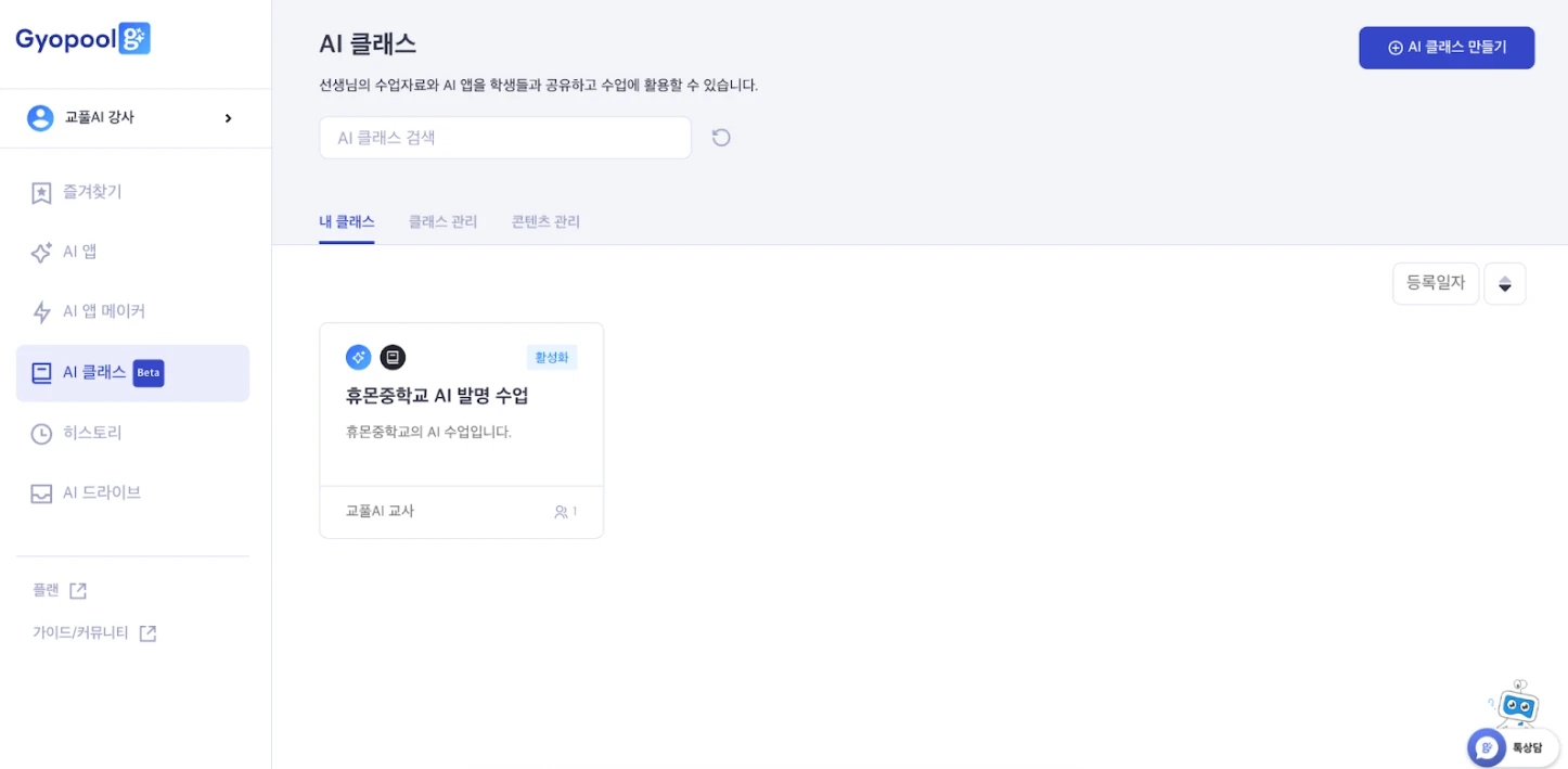 👀 AI 리터러시 모니터, 여기서 확인하세요! “교풀AI 리터러시 모니터링”는 학생들이 언제, 어떤 AI 앱을 사용했는지를 한눈에 보여주는 참여도 추적 입니다. AI 활동 모니터링 기능을 통해, 교사는 학생들의 AI 활동 내용을 직관적으로 파악하고 올바른 AI 사용 방향을 지도함으로써 비교육적 활동을 사전에 방지할 수 있습니다. 선생님은 이 기능을 통해 학생들의 AI 앱 실행 횟수 활동 시간대와 활용 내역을 상세히 확인할 수 있습니다. 예를 들어, 국어 수업에서는 학생들이 ‘에세이 작성 지원 AI’를 얼마나 활용했는지, 수학 수업에서는 ‘문제 풀이 AI’를 언제, 몇 번 사용했는지를 즉시 확인할 수 있습니다. 이제 학생들이 단순히 “참여했는지” 확인하는 것을 넘어, AI를 어떻게 활용하고 학습에 적용하는지까지 데이터로 살펴보세요. AI 리터러시 모니터가 선생님의 수업 운영을 더 투명하고 스마트하게 만들어 드립니다. 🚀 1️⃣ AI 클래스 생성하기 먼저 학생들과 함께할 AI 클래스를 만들어야 합니다. AI 클래스 생성 방법은 아래 가이드를 참고하세요. 2️⃣ 클래스 관리 탭으로 이동 생성된 AI 클래스 화면에서 「클래스 관리」 탭을 클릭합니다. 3️⃣ 리터러시 모니터 열기