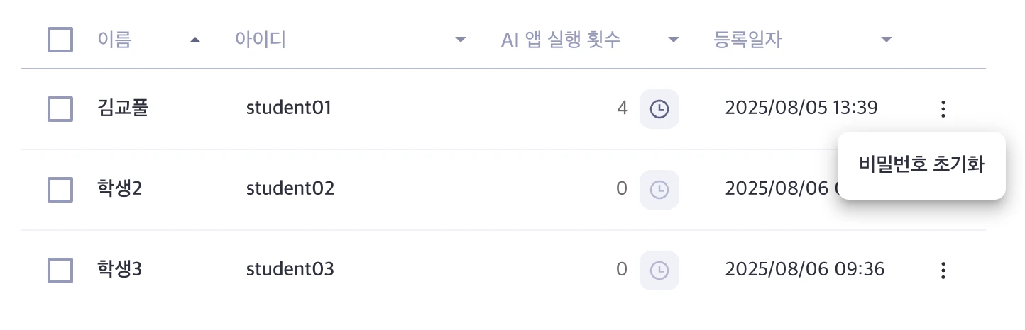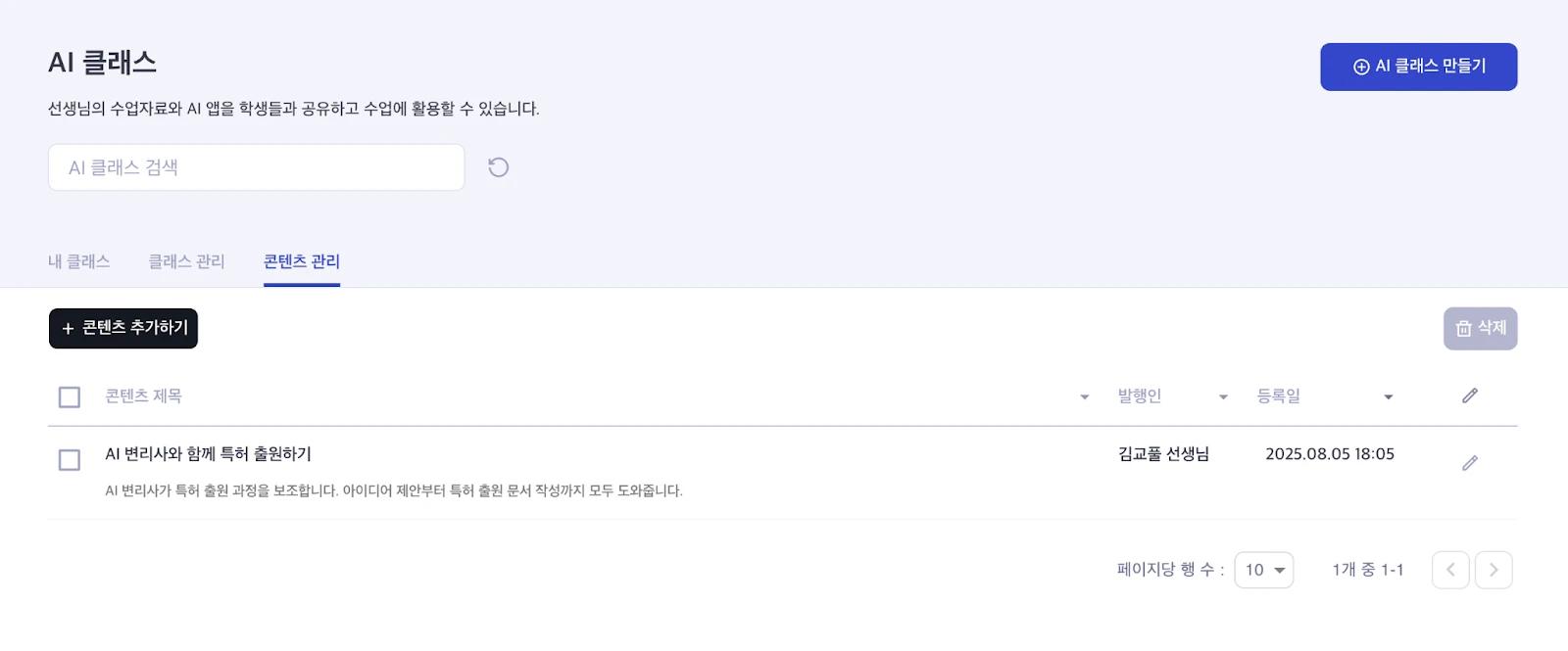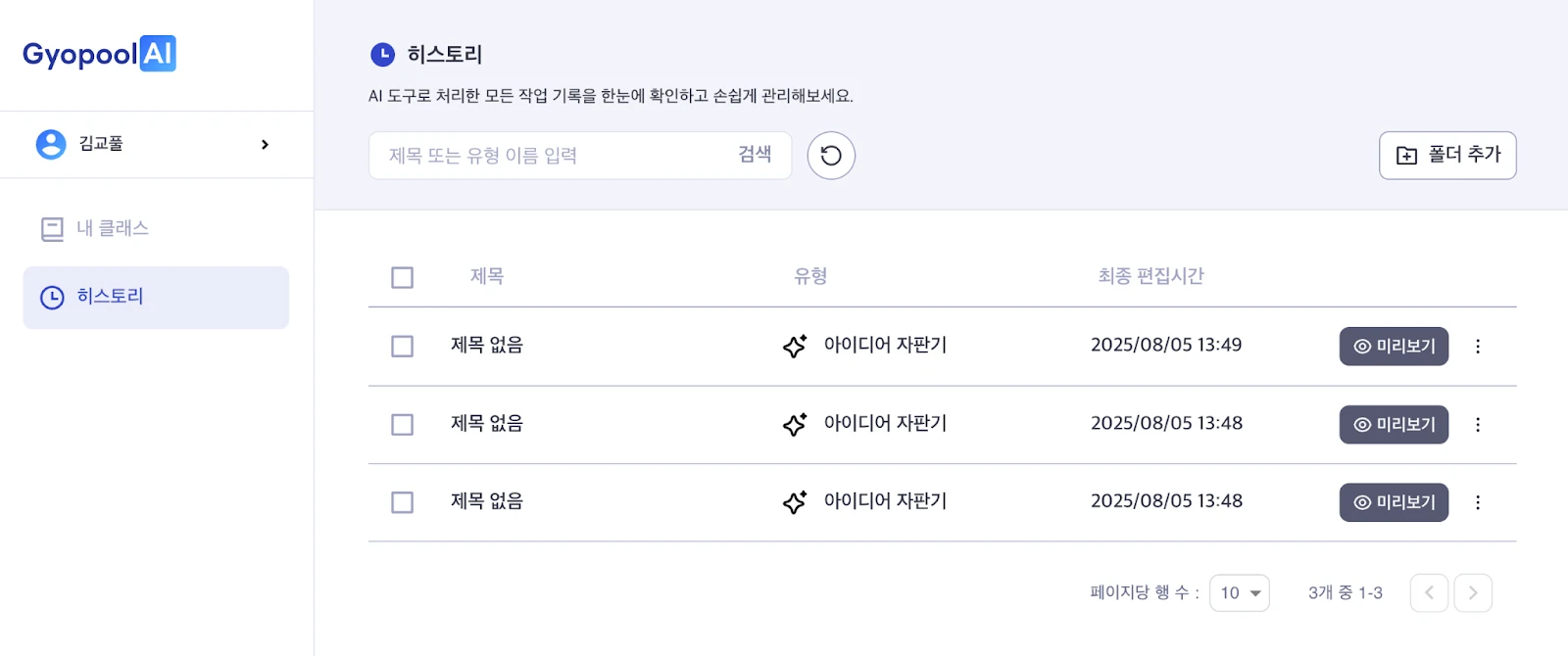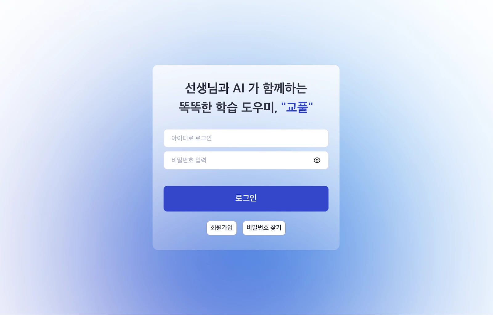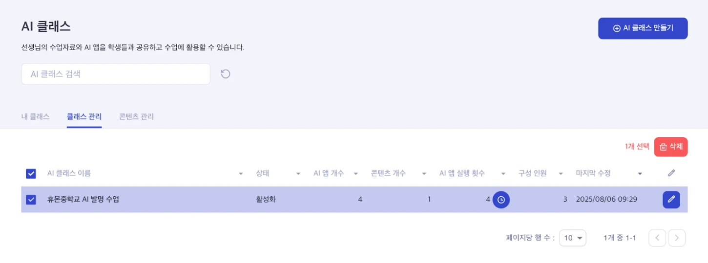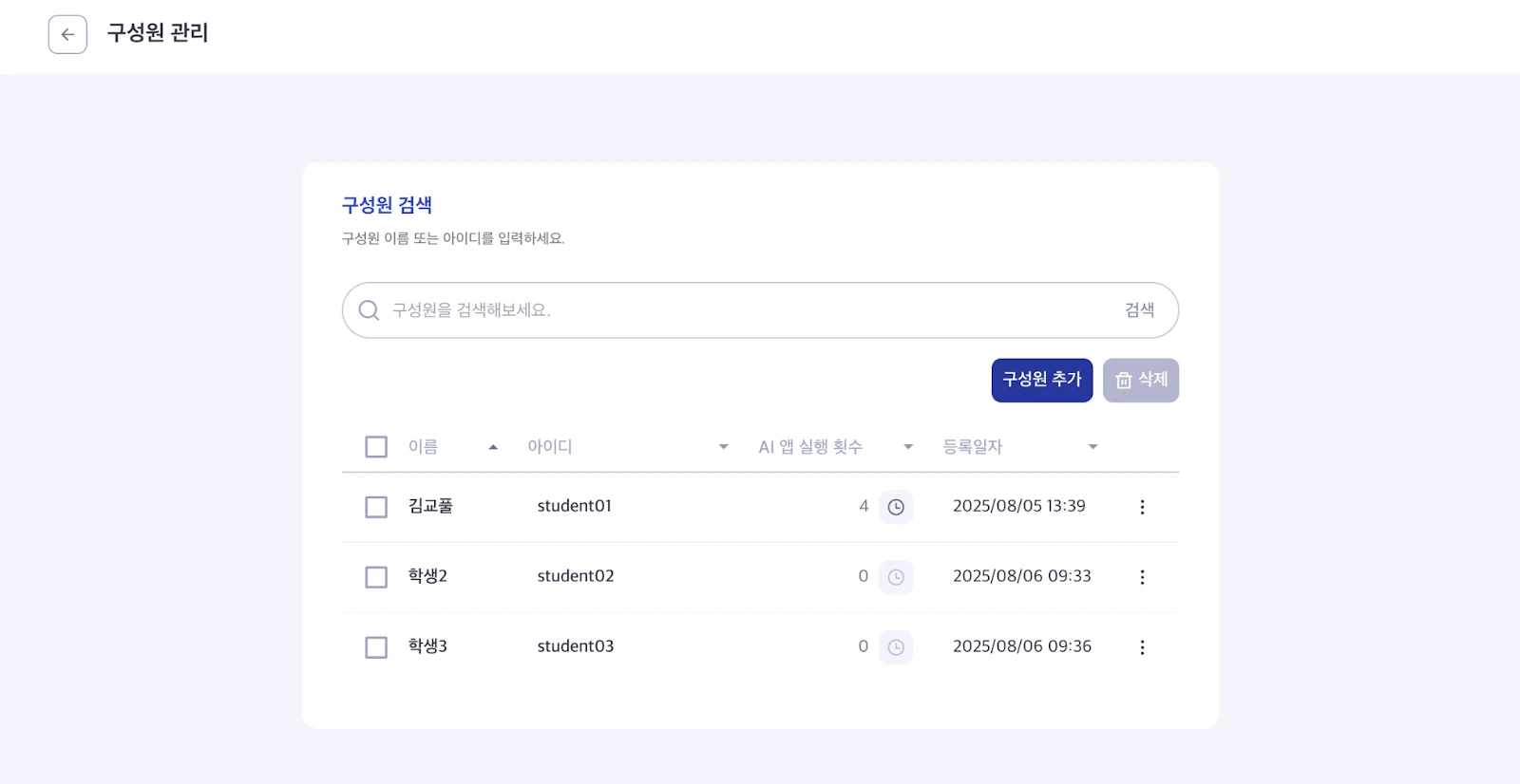 👀 AI 리터러시 모니터, 여기서 확인하세요! “교풀AI 리터러시 모니터링”는 학생들이 언제, 어떤 AI 앱을 사용했는지를 한눈에 보여주는 참여도 추적 입니다. AI 활동 모니터링 기능을 통해, 교사는 학생들의 AI 활동 내용을 직관적으로 파악하고 올바른 AI 사용 방향을 지도함으로써 비교육적 활동을 사전에 방지할 수 있습니다. 선생님은 이 기능을 통해 학생들의 AI 앱 실행 횟수 활동 시간대와 활용 내역을 상세히 확인할 수 있습니다. 예를 들어, 국어 수업에서는 학생들이 ‘에세이 작성 지원 AI’를 얼마나 활용했는지, 수학 수업에서는 ‘문제 풀이 AI’를 언제, 몇 번 사용했는지를 즉시 확인할 수 있습니다. 이제 학생들이 단순히 “참여했는지” 확인하는 것을 넘어, AI를 어떻게 활용하고 학습에 적용하는지까지 데이터로 살펴보세요. AI 리터러시 모니터가 선생님의 수업 운영을 더 투명하고 스마트하게 만들어 드립니다. 🚀 1️⃣ AI 클래스 생성하기 먼저 학생들과 함께할 AI 클래스를 만들어야 합니다. AI 클래스 생성 방법은 아래 가이드를 참고하세요. 2️⃣ 클래스 관리 탭으로 이동 생성된 AI 클래스 화면에서 「클래스 관리」 탭을 클릭합니다. 3️⃣ 리터러시 모니터 열기